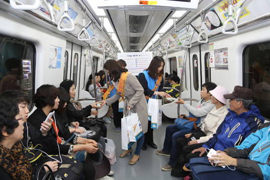 [프라임경제] 광주도시철도공사 임직원 및 서비스 마케터, 금호고속 임직원, 상무지구대 소속 경찰 등 30여명으로 구성된 '지하철 행복지킴 캠페인단'은 28일 전동차 탑승 승객들에게 '휴대폰은 진동으로' '교통약자에 자리 양보하기' '에스컬레이터 손잡이 잡기' 등 지하철 에티켓 지키기 캠페인을 펼쳤다.