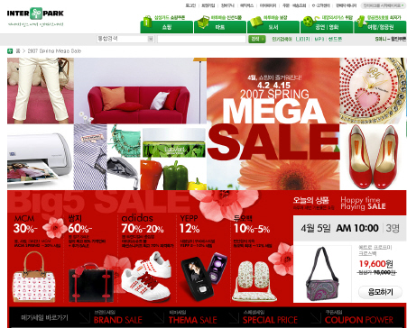 5일 업계에 따르면 인터파크(www.interpark.com)는 4월 15일까지 '2007 스프링 메가 세일'을 열고 가전, 의류, 화장품, 잡화, 주방 용품, 가구 등 전 품종을 대상으로 브랜드세일, 테마세일, 스페셜프라이스, 쿠폰파워 등 4가지 주제로 최대 85% 할인하고, 무료배송,무이자 할부, 깜짝할인 등의 혜택을 함께 제공한다.