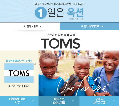 이은지 옥션 제휴마케팅팀장은 "'착한 소비'의 대표 브랜드인 탐스의 국내 오픈마켓 최초 입점을 기념한 나눔 기획전을 마련했다"며 "연말을 맞아 쇼핑과 함께 기부를 실천할 수 있는 좋은 기회가 될 것”이라고 말했다.