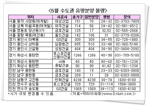 부동산 정보회사 닥터아파트(www.DrApt.com)에 따르면 5월 수도권에서 분양하는 아파트는 모두 47곳 2만4432가구(주상복합 포함)인 것으로 조사되었다.