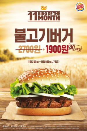 버거킹은 이번 프로모션을 통해 버거킹의 불고기버거를 기존 가격 2700원에서 약 30% 할인된 1900원에 제공할 예정이다.