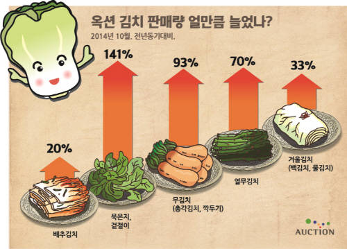 옥션 임학진 푸드팀장은 "올해 전반적인 배추 풍작을 맞아 여러 지역에서 절임배추를 비롯해 다양한 지역 김치를 선보이고 있어 김치재료와 김치 자체의 판매량이 더 늘 것으로 예상한다"고 말했다.