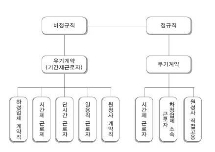 먼저 가장 큰 테두리에서는 비정규직과 정규직으로 구별할 수 있습니다. 비정규직은 쉽게 근로기간의 정함이 있느냐 없느냐로 가립니다.