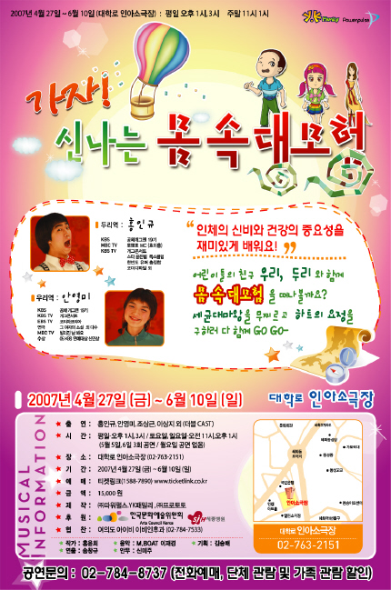 [프라임경제]인체의 신비와 장기의 기능을 재미있게 알려주는 어린이 뮤지컬 ‘가자! 신나는 몸속 대모험’이 오는 4월 27일부터 6월 10일까지 대학로 인아소극장에서 공연한다.
