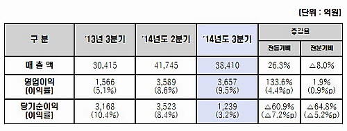 계절적 비수기의 영향으로 2분기 대비 제품 판매량은 감소했지만, 고부가강 판매증가와 냉연부문 합병시너지 극대화를 통한 수익성 향상에 따라 매출액과 영업이익은 전년동기 대비 각각 26.3%, 133.6% 늘었으며 영업이익률은 9.5%를 시현했다는 설명이다.