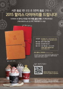 이번 이벤트는 시즌 음료 1잔을 포함해 총 5잔의 음료를 구매하는 고객이 대상이며, 쿠폰을 모두 모은 고객에게는 2만4000원 상당의 '2015 할리스커피 다이어리'를 무료로 증정한다.
