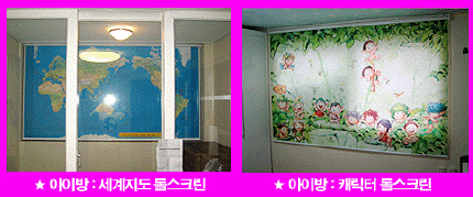 아이방 창문은 꿈과 상상력을 키워줄 수 있는 캐릭터 이미지 롤스크린과 세계지도 롤스크린으로 넓은 세상을 향한 꿈을 심어줄 수 있어 공부방의 의미를 살려 줄 수 있다.