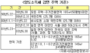 올해까지만 양도소득세를 감면받을 수 있는 일몰제란 <표>에 해당하는 주택을 분양받은 사람이 다른 주택을 한채 더 보유하고 있다면, 이를 올해 안에 매도할 경우 1가구1주택으로 인정해 세제 적용을 해 주는 제도다.