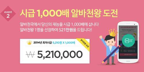 '시급 1000배 알바천왕 도전'은 본인만의 특별한 재능으로 활약했던 이색 알바 경험담을 공유한 1인을 뽑아 시급(2014년 최저임금 5210원)의 1000배인 '521만원'을 증정한다. 일명 '재능 활약 시상식'으로 알바생들의 재능을 응원해 앞으로 더 가치 있게 계발하라는 의미를 담았다.
