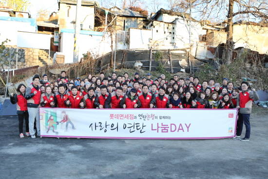 13일 롯데면세점 임직원 100여명은 서울 노원구 중계 본동에 위치한 연탄은행에 연탄 1만5000장을 기부하고 저소득층 가정에 직접 배달했다.