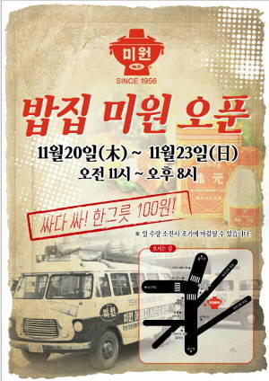 밥집 미원 운영시간은 20~22일 오전 11시부터 밤 9시, 마지막 날인 23일은 오후 2시까지다.