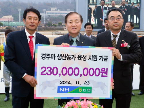 [프라임경제] 농협과 한국마사회는 지난 23일 서울경마공원에서 '제11회 농협중앙회장배 대상경주 대회'를 개최하고, 경주마 생산농가 육성지원 기금으로 2억3000만원을 전달했다고 24일 밝혔다.