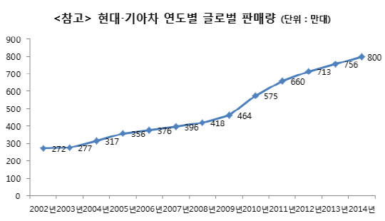현대·기아차의 800만대 판매는 우리나라 주력 수출 상품인 자동차부품 및 완성차 수출 확대, 부품 협력업체 글로벌 경쟁력 강화 등과 직결되는 만큼, 우리나라 경제에 긍정적 영향을 미칠 것으로 기대된다.
