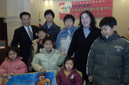 지난해 12월 15일 서울시 태평홀에서 있었던 다자녀가정지원사업 협약식에서 다자녀 가정과 함께 기념촬영, 롯데시네마 김광섭 대표(좌)