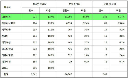 대한항공은 다른 저가항공사 대비 보유항공기는 10배, 종사자는 20배 이상 많은데도 국토부에 신고된 '운항기준' 준수만 점검한다는 것이다.