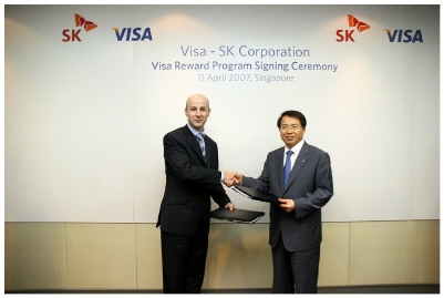 비자 인터내셔널 아태지역 Rupert Keeley(루퍼트 킬리) 사장과 SK주식회사의 김명곤 부사장은 4월 11일 싱가포르에 위치한 비자 인터내셔널의 아태지역 본사에서 ‘비자 리워드 프로그램’을 실시에 대한 서명을 했다.