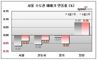 스피드뱅크(www.speedbank.co.kr)에 따르면, 서울·수도권 아파트 주간(4월7일~13일) 매매가격 변동률이 서울 -0.03%, 신도시 -0.03%, 경기 -0.05%로 3주 연속 내림세를 나타냈다. 인천은 0.08% 올라 지난주와 같았다.