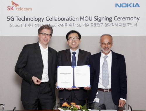 최진성 SK텔레콤 종합기술원장과 호세인 모인 노키아 기술·혁신(Technology and Innovation) 총괄은 2018년 시연을 목표로 5G기술에 대한 선행개발 및 검증에 공동 협력하는 내용의 협약을 21일(현지시각) 핀란드 에스푸(Espoo) 노키아 본사에서 체결했다.