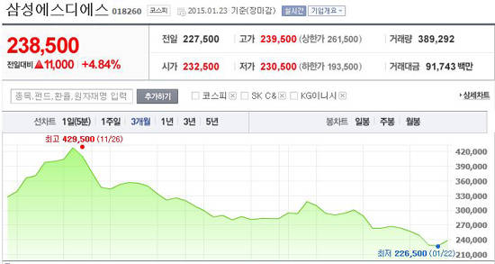 첫 상장일인 지난해 11월14일 공모가대비 72.36% 치솟은 32만7500원을 찍었던 삼성SDS는 같은 달 26일 장중 43만원에 육박하며 30% 넘는 폭등세를 기록했다.