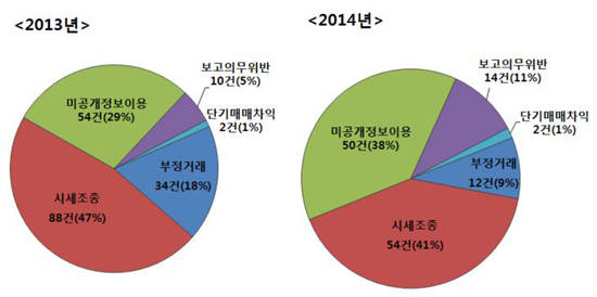 혐의유형별로는 △시세조종(54건) △미공개정보이용(50건) △보고의무위반(14건) △부정거래(12건) △단기매매차익(2건) 순으로 시세조종과 부정거래건수는 1년 사이 급감했고 미공개 정보이용행위는 전년과 비슷한 수준이었다.