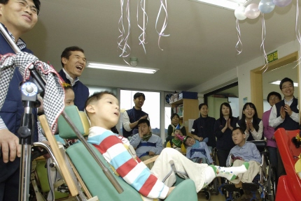 이 날 SK C&C 자원봉사단 중 하나인 ‘행복나눔’ 봉사단 회원들은 이 날 특수 휠체어 등의 기증품을 전달하고 아동들의 사회적응 훈련 중 하나인 ‘은행 ATM 이용하기’를 도우며 아동들과 즐거운 시간을 보냈다.