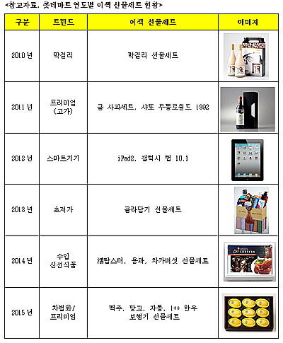 25일 롯데마트의 지난 5년간 설 명절 선물세트 분석에 따르면 연도별 소비 트렌드에 따라 매년 새로운 이색 선물세트가 등장했다.