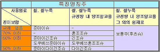 위의 표처럼 준마이긴조슈와 도쿠베쓰준마이슈, 긴조슈, 도쿠베쓰혼조조슈가 같은 범위에 속하지만 사용원료와 정미보합의 조건만으로는 구별하기 어렵습니다.