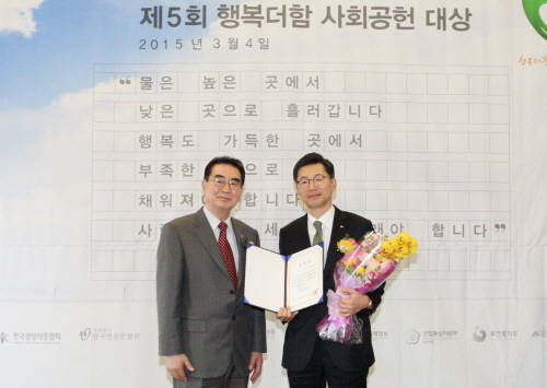 한편 한국경영자총협회와 사단법인 한국언론인협회가 주최하고 한국지속경영평가원이 주관하는 행복더함 사회공헌대상은 기획재정부, 지식경제부, 보건복지부, 환경부, 고용노동부가 후원한다.