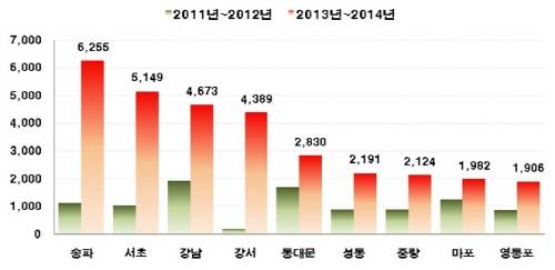 한편, 최근 2년 간 분양물량이 가장 많은 곳은 서초구로 총 9831가구가 분양됐다. 이어 △강남구 8418가구 △강서구 7113가구 △강동구 5139가구 △서대문구 4596가구 △영등포구 4391가구 순으로 집계됐다.