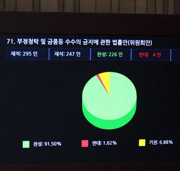 당초 원안에는 △부정청탁 금지 △금품수수 금지 △이해충돌 방지, 세 가지 규정이 있었지만 두 개만 통과됐고, 공직자의 사익추구를 금지하는 이해충돌 방지 규정이 빠졌다는 것.