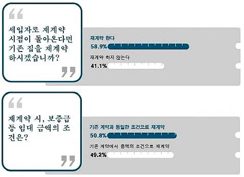 벼룩시장 부동산에 따르면 전국 전·월세 세입자 620명 중 58.9%는 재계약 시 기존 집을 '재계약 한다'고 답했다.