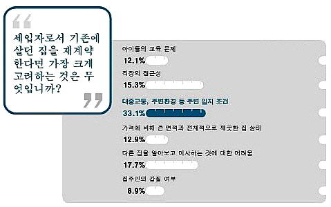 한편, 기존 집을 재계약하는 가장 큰 이유로 세입자 열에 셋(33.1%)은 '주변입지'를 꼽았다. 이어 △다른 집을 알아보고 이사하는 번거로움(17.7%) △직장 접근성(15.3%) △가격에 비해 큰 면적과 깨끗한 집 상태(12.9%) △자녀 교육문제(12.1%) △집주인 갑질여부(8.9%) 순으로 집계됐다.