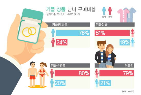 온라인쇼핑사이트 G마켓이 밸런타인데이, 화이트데이 등 커플 기념일이 포함된 올해 초를 기준으로 커플상품의 남녀 구매량을 조사한 결과 커플상품을 구매하는 쪽은 주로 여성이지만, 커플링(골드)만큼은 남성이 더 많이 구매했다.