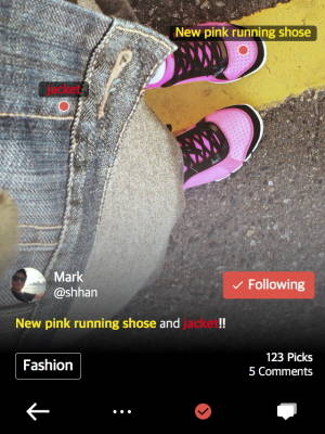 예를 들어, 요즘 유행하는 데일리패션 사진을 올리고 가방과 신발 등 패션 아이템을 가리켜 각각의 설명을 사진 내에 달 수 있다.