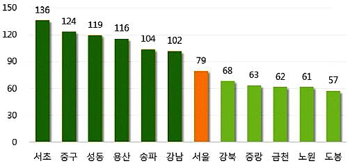 월세값이 가장 비싼 곳은 서초구로 평균 136만원에 달했다. 이어 △중구 124만원 △성동구 119만원 △용산구 116만원 △송파구 104만원 △강남구 102만원 순으로 나타났다.