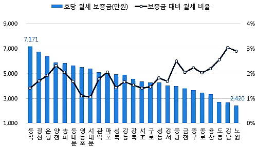 반면, 보증금이 높고 월세비중이 낮은 지역은 영등포구와 서대문구로 보증금 대비 월세비율이 각각 1.1%를 차지했다.