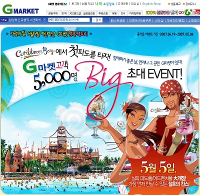 오픈마켓 G마켓(www.gmarket.co.kr)은 오는 5월 5일 어린이 날을 맞아 고객 5,000명을 추첨해 어린이날 당일 '케리비안베이'를 무료로 즐길 수 있는 BIG이벤트( 사진)를 개회한다.