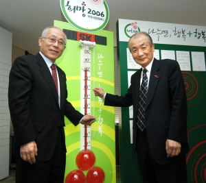 | 조정남 SK자원봉사단장(오른쪽)이 28일 서울 중구 정동에 있는 사회복지공동모금회를 방문해 이세중 회장에게 이웃사랑성금 100억원을 전달한 후 사랑의 체감온도를 높이고 있다. | ||