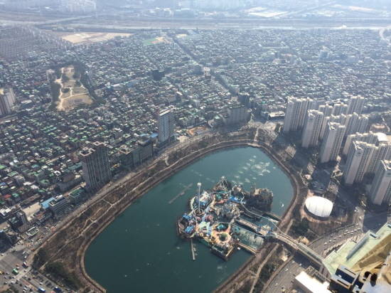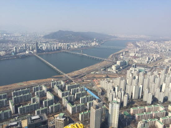 100층 높이에서 바라보면 맑은 날에는 멀리 송도신도시까지 보인다지만, 이날은 옅은 안개와 미세먼지 때문에 성남시 끝자락이 흐릿하게 보이는 정도였다. 동행한 롯데물산 관계자는 "바람이 많이 부는 날엔 춥지만 시야는 더 좋다"고 말했다.
