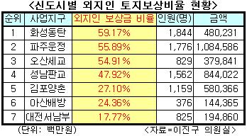 사업지별 외지인 토지보상비율은 ▲ 화성동탄 59.17% ▲ 파주운정 55.89% ▲ 오산세교 54.91% 등 3곳은 외지인 보상액 비율이 많았고 ▲ 성남판교가 47.92%에 달하는 등 수도권 신도시개발지의 외지인 비율이 높았다.
