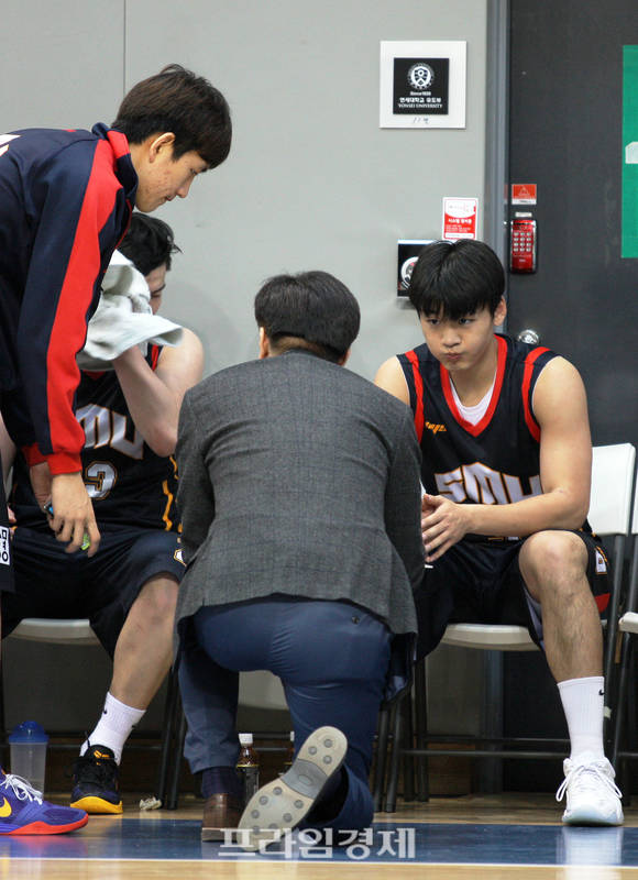 [프라임경제] 8일 연세대학교체육관에서 열린 상명대와 연세대의 2015 남녀 대학농구리그 경기에서 작전타임 중 상명대 류지석이 이상윤 감독의 작전 지시에 집중하고 있다.
