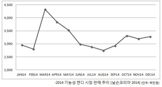 시장조사기관 닐슨코리아의 자료에 따르면 3~4월 기능성 캔디류의 판매량이 연평균 대비 25% 가량 증가한 것으로 나타났다. 봄철 황사와 미세먼지, 꽃가루 등이 기승을 부리면서 소비자들의 호흡기 건강 관리에 대한 관심이 높아지면서 캔디 하나도 호흡기 건강에 도움을 주는 제품이 주목 받는 것이다.