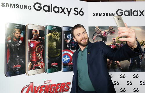이날 영화 어벤져스에 등장하는 '캡틴 아메리카' 크리스 에반스는 '갤럭시S6'로 사진을 찍고, 어벤져스 캐릭터를 적용한 '갤럭시S6' 후면커버와 테마를 소개했다.