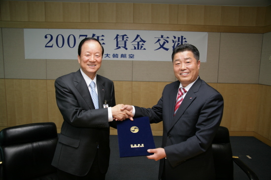 [프라임경제]대한항공 노동조합이 2007년도 임금교섭 전권을 회사에 일임했다. 대한항공 노조는 25일 오후 서울 공항동 본사 빌딩에서 이종희 총괄사장과 이대규 노조위원장이 참석한 가운데 가진 2007년도 임금교섭에서 회사에 일임한다고 밝혔다.
