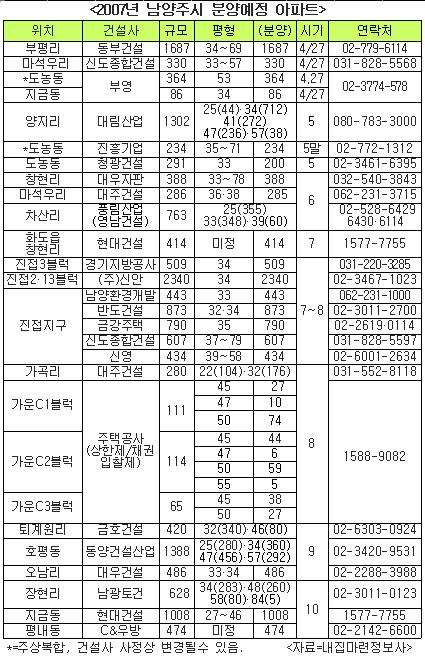 연말까지 28곳 1만7115가구 중 1만7024가구가 일반분양될 예정인데, 남양주시 진접읍 장현·연평·금곡리, 오남읍 양지리 일대 62만3000여 평의 진접택지개발지구에는 7~8월께 첫 아파트 분양이 시작된다. 남양환경개발·경기지방공사·신영·금강주택·반도건설 등 7개 업체가 6000여 가구를 동시분양한다.