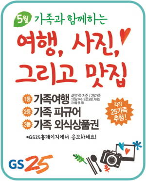 [프라임경제] 편의점 GS25는 개점 25주년과 5월 가정의 달을 맞아 가족을 주제로 한 경품 이벤트와 함께 다양한 행사를 진행한다고 30일 밝혔다.
