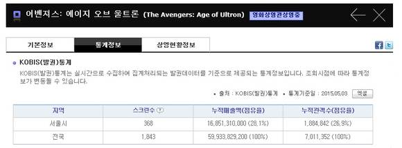 4일 영화진흥위원회 영화관입장권통합전산망 집계에 따르면 '어벤져스2'는 국내 개봉 옇흘 만에 누적관객수 701만1352명, 누적매출액 599억3382만원을 달성한 것으로 나타났다.