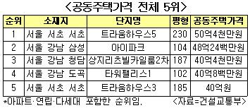 공동주택 공시가 전국 1위에는 50억4000만원을 기록한 서울 서초구 트라움하우스 5차 230평형(연립주택)인 것으로 나타났다. 뒤를 이은 것은 강남 삼성동 아이파크 104평(아파트)으로 48억2400만원을 기록했다. (표 참고)