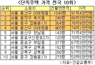 시장·군수·구청장이 공개하는 단독주택 공시가의 경우 전국 상위 10걸에는 용산·동작·중구·종로·성북구 지역 주택이 대부분이었으며, 단독주택 전국 최저가는 경북 울진군 서면 소재 주택으로 30만9000원이었다.