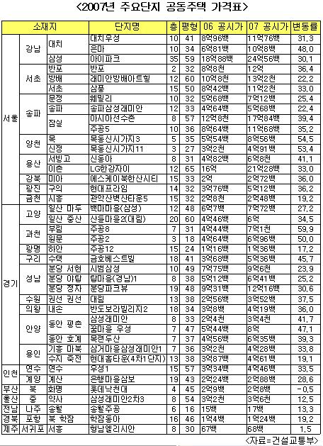 29일 건교부가 밝힌 전국 주요단지 공동주택가격(표 참고)에 따르면, 과천 부림동 주공8단지 7층 31평형이 지난해 공시가 4억4400만원에서 올해 7억1000만원으로 일년새 59.9%가 오른 것으로 나타났다. 주된 원인은 지난해 말 집값 폭등에 따른 상승분에 올해부터 공시가격이 시세의 70%선에서 80%선으로 상향 조정되었기 때문으로 분석되고 있다.